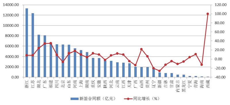 2018年上半年,浙江、江蘇兩省建筑業企業新簽合同額繼續占據前兩位,分別達到13300.42億元和12391.65億元。新簽合同額超過4000億元的還有湖北、廣東、福建、四川、北京、山東、河南、上海和湖南等9個地區(圖3)。新簽合同額同比增長較快的地區是西藏、福建、廣東、湖北、山西和河南,增幅均超過了15%。11個地區新簽合同額出現負增長,其中新疆和遼寧的負增長均超過了20%,廣西、海南、吉林和內蒙古的負增長也超過了10%。